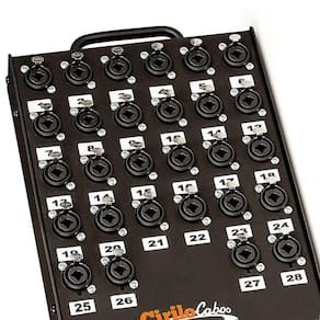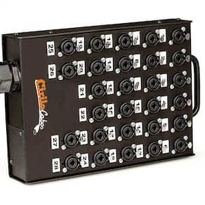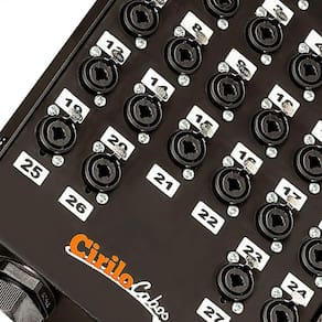 A banheira da Cirilo Cabos feita em metal com pintura epóxi preto, tem uma alça para facilitar o transporte. O cabo espaguetado e numerado via-a-via orienta na usabilidade do produto. Na extremidade do multicabo, tem uma mola de proteção. Esta caixa de conectores é resistente e durável, suporta o ritmo de trabalho de quem produz engenharia sonora.
