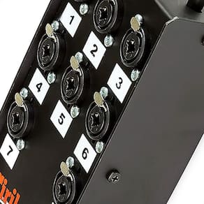 Medusa montada pela Cirilo Cabos com conectores Combo, marca própria. A vantagem do combo é poder plugar dois tipos distintos de conectores, o XLR e o P10 plug banana. Na ponta dos cabos vão conectores XLR macho. Este produto é ideal para transmissão de som profissional, sem prejuízos na qualidade ou interferência de ruídos externos.