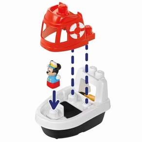 Crianças de 1 a 3 anos podem montar o rebocador e o ambiente com blocos decorados para velejar com o Mickey