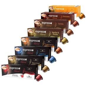 Mega Kit Espresso Blend Cápsulas de Café - Compatíveis com Nespresso Experimente as Cápsulas Compatíveis com Nespresso Espresso Blend e descubra como o café perfeito pode ser acessível sem comprometer o sabor. Conteúdo e características do Kit: - Contém 8 caixas com 10 cápsulas cada: total de 80 cápsulas de café - Café 100% arábica - Não contém glúten - Cápsulas compatíveis com Nespresso Kit de cápsulas com 8 sabores diferentes: - 10 cápsulas de café Blend Vanilla e Nozes - 10 cápsulas de café Blend Tradicional - 10 cápsulas de café Blend Intenso - 10 cápsulas de café Blend Gourmet - 10 cápsulas de café Blend Extra Forte - 10 cápsulas de café Blend Canela - 10 cápsulas de café Blend Chocolate - 10 cápsulas de café Blend Laranja Especificações técnicas: - Peso líquido de cada caixa: 50 g - Peso líquido por cápsula: 5 g - Validade: 18 meses
