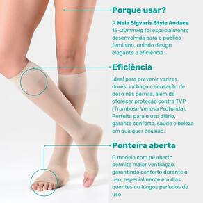Meia compressiva feminina, Sigvaris Style Audace, meia 3/4 natural, prevenção de varizes, meia para pernas cansadas, trombose venosa profunda, meia 15-20mmHg, meia elegante, saúde das pernas, estilo e conforto, sigvaris, meia de compressão, antitrombo.