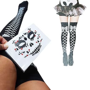 Meia 7/8 Halloween + Adesivo Facial Face Jewels Caveira: Kit Fantasia Cosplay Carnaval.