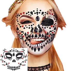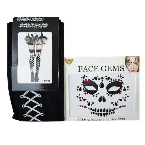 Contém: 1 par de meia 7/8 preta Halloween + 1 cartela Face Jewels Caveira.