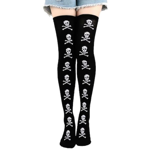 Meia 7/8 Longa Adulto Festa Fantasia Halloween Cosplay: Modelo Caveira Pirata. Tamanho único que atende da numeração 35 a 40. Cor Preta com desenho de caveira modelo pirata. Modelo 7/8 é um comprimento que vai acima do joelho e fica na altura da coxa, pedindo looks mais curtinhos e deixando as meias em evidência, mostrando assim todo o charme e elegância, valorizando ainda mais o look. Ideal para festas à fantasia, Cosplay, Halloween, dança e uma variedade de trajes. Possui bastante elasticidade, promovendo leveza e conforto. Não aperta e não desce, permanecendo firme no lugar. Pode ser utilizada com salto alto, tênis e sandálias. É recomendável lavar à mão, pois o tecido é delicado. Medidas do produto em cm: 70 altura x 11 largura. Composição: 90% Poliéster, 10% Spandex. Atenção: Produto de alto giro. Recebemos novas remessas semanalmente e algum detalhe pode variar conforme o lote recebido, porém o produto é o mesmo e mantém as mesmas características e qualidade. Contém: 1 par de meias 7/8 - Modelo Caveira Pirata. Fotos ilustrativas e reais do produto.