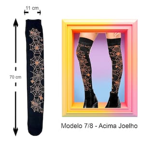 Meia 7/8 Longa Adulto Festa Fantasia Halloween Cosplay: Modelo Teia de Aranha Laranja. Tamanho único que atende da numeração 35 a 40. Cor Preta com desenho teia com aranhas na cor laranja. Modelo 7/8 é um comprimento que vai acima do joelho e fica na altura da coxa, pedindo looks mais curtinhos e deixando as meias em evidência, mostrando assim todo o charme e elegância, valorizando ainda mais o look. Ideal para festas à fantasia, Cosplay, Halloween, dança e uma variedade de trajes. Possui bastante elasticidade, promovendo leveza e conforto. Não aperta e não desce, permanecendo firme no lugar. Pode ser utilizada com salto alto, tênis e sandálias. É recomendável lavar à mão, pois o tecido é delicado. Medidas do produto em cm: 70 altura x 11 largura. Composição: 100% Poliéster. Atenção: Produto de alto giro. O desenho pode variar em algum detalhe conforme o lote recebido, porém o produto é o mesmo e mantém as mesmas características e qualidade. Contém: 1 par de meias 7/8 - Modelo Teia de Aranha Laranja. Fotos ilustrativas e reais do produto.