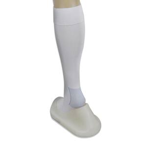 A indicação no calcanhar auxilia na colocação correta da meia para melhor utilidade.
