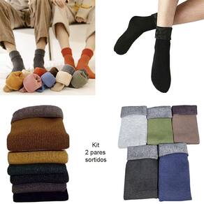 Meia Masculina Térmica Canelada com Pelúcia Fleece Frio Intenso: Kit 2 pares Cano Médio.Tamanho único que atende da numeração 39 a 46 pois possui elasticidade se moldando aos pés.Cores entre: marrom, preto, verde, azul marinho, cinza, podendo variar em outras cores conforme lote recebido. Enviaremos kit com 2 cores diferentes, proporcionando ainda maior versatilidade na combinação dos looks.Tecido interno aveludado proporcionando isolamento térmico que repele o frio e mantém a temperatura do corpo. Pés quentes mesmo em contato com extremidades geladas como pisos e porcelanatos.Tecido respirável anti-odor: o aveludado interno absorve a umidade transportando-a para a face externa do tecido, mantendo a temperatura do corpo sempre estável. O tecido externo possui micro poros que aceleram a evaporação da umidade da pele, evitando odores.O tecido se adapta ao contorno dos pés, tornando as meias ainda mais confortáveis e extremamente fáceis de calçar. Costuras planas que evitam o desconforto durante a utilização.Projetada para ser utilizada com qualquer tipo de calçado, esteja você em casa ou no trabalho, em eventos ou mesmo viajando para lugares de temperatura muito baixa.Material: Algodão, Poliéster e Lã. Tamanho do produto: 33 cm comprimento x 9 cm largura.Modelo: Cano Médio.Atenção: Produto de alto giro. Recebemos novas remessas semanalmente e algum detalhe pode variar conforme lote recebido, porém o produto é o mesmo e mantém as mesmas características e qualidade. Devido alta rotatividade NÃO é possível a escolha das cores. Enviaremos 2 cores diferentes conforme disponibilidade de estoque. Fotos ilustrativas e reais do produto. Contém: 2 pares em cores diferentes enviadas aleatoriamente.