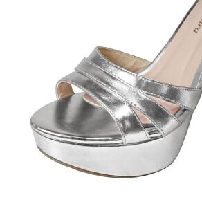 Linha de Meia Pata Salto Alto Fino Luiza Sobreira, produzida em material sintético na cor Prata, com palmilha e forro em P.U., solado em TR.