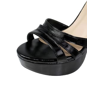 Linha de Meia Pata Salto Alto Fino Luiza Sobreira, produzida em material sintético metalizado na cor Preta, com palmilha e forro em P.U., solado em TR.