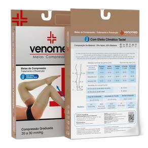 Meias compressão 20 a 30mmhg aberta 7/8 venomed tromb2100 Tamanho: m Cor: bege Informações completas na parte interna da embalagem. Medir: tornozelo, panturrilha, coxa. As meias da linha tromb facilitam o retorno venoso das pernas, melhoram a circulação sanguínea, aliviam dores, reduzem inchaço e previnem varizes, conforme indicação médica. Oferecem efeito climático, evitando calor excessivo em dias quentes e frio em dias frios, proporcionando conforto térmico. O efeito compressivo é garantido por 3 a 6 meses, segundo padrões internacionais. A durabilidade física varia com os cuidados de conservação e manuseio do paciente. Marca: Não Informado