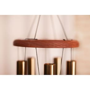 Característica 1: Som suave e reconfortante Característica 2: Ressonância duradoura Característica 3: Para meditação, relaxamento, aplicações terapêuticas ou decoração Característica 4: 5 barras de alumínio bronzeado Característica 5: Símbolo da Árvore da Vida na extremidade inferior Característica 6: Topo redondo de madeira Característica 7: Pêndulo com altura ajustável Característica 8: Anel de suspensão Afinação: G#5, A5, B5, D6, E6 — base A4/a' 432 Hz Material: Alumínio