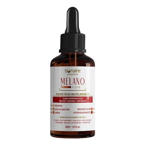 Melano Fluid é um fluido clareador de uso diário, desenvolvido para auxiliar no cuidado completo da pele. Sua fórmula avançada combina ativos que promovem sensação de hidratação prolongada, suavidade e luminosidade, deixando a pele com aparência uniforme e radiante. Textura leve e rápida absorção, indicado para todos os tipos de pele e para uso em qualquer época do ano.Benefícios e característicasSensação de pele hidratada e com textura uniformeClareadorToque confortávelAção antioxidanteTextura leve de rápida absorçãoIndicado para uso diárioLivre de parabenosPrincípios ativosÁcido Tranexâmico, PHE Resorcinol, Bakuchiol, Vitamina C 35, Ácido Ferúlico, Niacinamida, Ácido Kójico e Caviar.Modo de usarPela manhã e à noite, com a pele limpa e seca, aplique o fluido sobre toda a face e espalhe até completa absorção. Não remover. Durante o dia, utilize protetor solar.