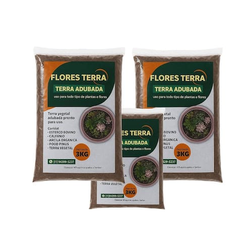 Melhor Terra Adubada Kit 3 - Crescimento Natural das Plantas O Kit 3 de Terra Adubada Flores Terra contém sacos de 3kg cada, desenvolvido para todos os tipos de plantas e flores. É um produto pronto para uso, composto por esterco bovino, calcário, argila orgânica, pó de pinus e terra vegetal, garantindo um solo rico em nutrientes e com ótima retenção de umidade. Benefícios: