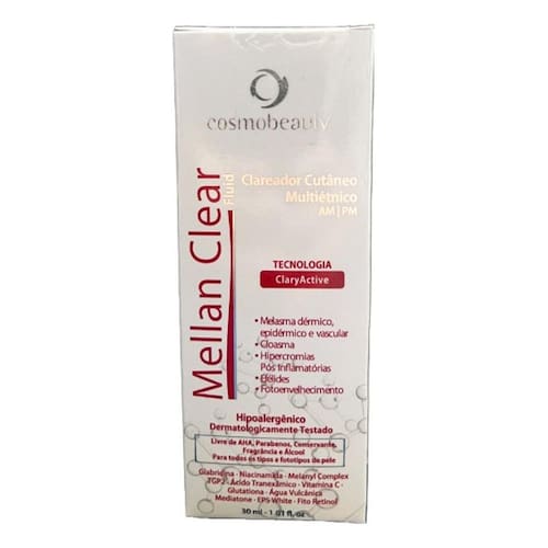 Mellan Clear Fluid é um concentrado clareador que atua nas hipercromias cutâneas em diferentes estágios: recentes, instaladas e recorrentes. Desenvolvida com fórmula concentrada em ingredientes que agem de forma sinérgica para reduzir e controlar a formação da tonalidade irregular da pele. A tecnologia ClaryActive atua nos principais mecanismos envolvidos no desenvolvimento das hipercromias cutâneas. A sinergia de ativos associada a fitocomponentes promovem a renovação da pele um clareamento eficaz e seguro, podendo ser aplicado de dia e de noite.