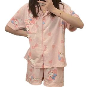 Pijama de primavera/verão com a adorável estampa Melody! Adicione frescor às suas noites quentes • Composição principal do tecido: fibra de poliéster • Tipo de gola: lapela • Função: lazer, respirável, para dormir, elástica, caseira, confortável • Estação adequada: verão, primavera • Estilo: desenho animado