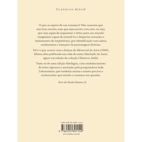 O que se espera de um romance? Não somente que seja bem escrito, mas que seja escrito com arte, ou seja, que consiga sequestrar o leitor para um mundo imaginário capaz de entretê-lo e despertar emoções e sentimentos de empréstimo, por identificação com ações, sentimentos e emoções de personagens fictícias. Tal é o que ocorre com a leitura de Memorial de Aires (1908), última obra publicada em vida do autor Machado de Assis, agora em edição da coleção Clássicos Ateliê. Trata-se de uma edição fidedigna, com estabelecimento de texto rigoroso e anotação pela pesquisadora Ieda Lebensztayn, que também assina o ensaio preciso e esclarecedor que estuda o romance em questão. [José de Paula Ramos Jr.] Apresentação: Ieda Lebensztayn Notas e Estabelecimento de Texto: José de Paula Ramos Jr. Ean: 9786555801149