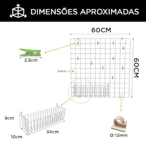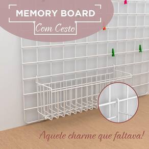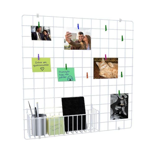 MEMORY BOARD PAINEL DE FOTOS DE TELA ARAMADA 60x60 BRANCO COM CESTO ORGANIZADOR N34Conhecido também como mural de recados, painel de parede ou cantinho motivacional, o Memory Board vai muito além de uma simples decoração para aquele seu cantinho amado.Você pode pendurar diversas coisas como fotos, lembretes de compromisso, datas especiais e, se você precisa daquela motivação especial para seu dia render mais, então é uma excelente ideia usá-lo para pendurar as anotações de seus sonhos, metas e objetivos.Assim sendo, você pode pendurar diversas coisas, o que vai depender unicamente da finalidade do cantinho onde ele estará.Ele é um item que tem a capacidade de te manter mais organizada e motivada!Nesse modelo diferenciado, acompanha um cesto aramado para organizar seus objetos de decoração ou para manter os itens de papelaria e escritório mais próximos, dando um charme a mais ao memory board.DIMENSÕES APROXIMADAS DA TELA: - Comprimento: 60cm - Largura: 60cm - Espessura da tela: 4mmDIMENSÕES APROXIMADAS DO CESTO: - Comprimento: 34cm - Largura: 10cm - Altura: 12cmCARACTERÍSTICAS: - Cor: Branco - Material: Aço - Tela aramada com malha de espaços de 5 cm ITENS INCLUSOS: - 01 Tela Aramada 60x60cm - 01 Cesto com Gancho N34 - Mini Prendedores - Clip Auto AdesivoOBSERVAÇÕES: - Garantia de 3 meses contra defeitos de fabricação. - Imagens ilustrativas - Não nos responsabilizamos pelo uso inadequado do produtoNão deixe de conhecer nossos outros produtos!