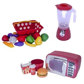 - 1 liquidificador de aproximadamente 17 cm de altura x 9,5 cm de largura --------------------------------------------------------------------------------- - 1 microondas 20 cm de comprimento x 10,5 largura x 12 cm altura não emite som e luz Com 1 forminha, 1 copinho de refrigerante, 1 balde de pipoca, 1 hambúrguer que se desmonta