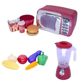 O kit vem com microondas, comidinhas, legumes e liquidificador