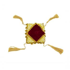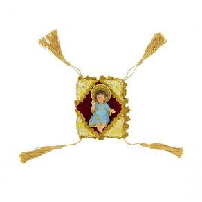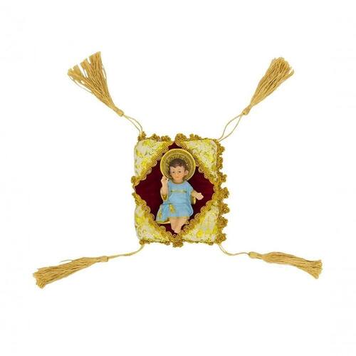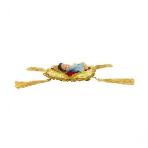 Enfeite decorativo na imagem do Menino Jesus com roupa azul de 8 cm de comnto deitado em uma almofada vermelha com detalhes em dourado de tecido. Material: resina