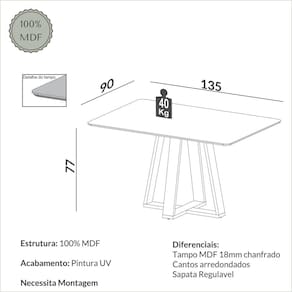 Mesa de jantar de 135cm para 4 lugares, produzida 100% em mdf, pintura UV 7 camadas, alta durabilidade, tampo 1,8cm chanfrado, cantos arredondados, com sapata regulável, pés cor freijó madeirado e tampo cor off white alto brilho. Acabamento: Pintura UV Acabamento da Base: Pintura UV Acabamento do Tampo: Pintura UV Ambiente Principal: Sala de Jantar Atóxico: Sim codigo_ean: 7900288115010 Complexidade da Montagem: Média: pode ser montado por mais de uma pessoa e/ou necessite de maior conhecimento para montagem Cor: Freijó/Off White Cor do Produto: Freijó/Off White Dobrável: Não Escala de Brilho: Brilhante Espessura do Tampo: 18 mm Extensível: Não Itens Inclusos: 1 Mesa, Manual de Montagem e Kit Ferragens Manual de Montagem e Instalação: https://product-hub-prd.madeiramadeira.com.br/992370/documents/8ee7a59b-3ecf-4304-9ca3-830ae31da12d2819894378117442039217814.pdf Marca: Dalla Costa Material da Base: MDF Material do Tampo: MDF Material Principal: MDF Medida da Base (A x L x P): 77x135x90 Medida da Mesa (A x L x P): 135x77x90 Medida do Tampo (L x C x E): 90x135x18 Necessita Montagem: Sim Origem do Produto: Nacional Peso: 27,2 kg Possui Portas: Não Possui prateleira: Não Possui Rodízio: Não Possui Suporte Giratório: Não Possui Vidro: Não Recomendações de Uso, Manutenção e Limpeza: Pano seco Sistema de Montagem: Parafuso Suporta Até (kg): 40 kg