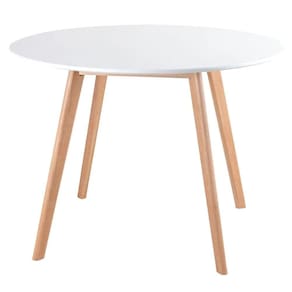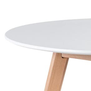 A mesa Leda redonda conta com tampo de MDF de alta resistência, acabamento refinado e base robusta em madeira, garantindo durabilidade e charme.