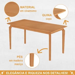 Mesa Pés em madeira maciça com perfis em MDF Tampo em MDF de 25mm com cantos arredondados e acabamentos PU nas bordas Tampo madeirado cinamomo em pintura UV