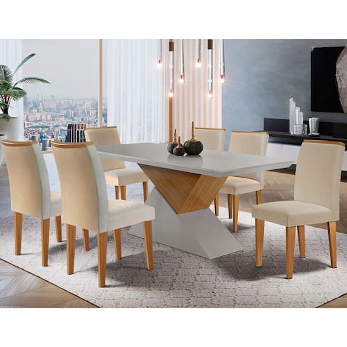 Mesa Aster 180 Tampo em MDF Canto Reto com 6 Cadeiras Lunara Moderna - Bege Claro