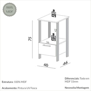 Mesa auxilia estilo industrial na cor freijó com pés de mdf cor preto, pintura uv 7 camadas, alta durabilidade, com 40cm de largura , 75cm de altura, 46cm de profundidade, com 1 gaveta com corrediça metálica na cor preta Acabamento do Tampo: Pintura UV Ambiente Principal: Sala de Estar codigo_ean: 7900288122643 Complexidade da Montagem: Média: pode ser montado por mais de uma pessoa e/ou necessite de maior conhecimento para montagem Cor: Freijó/Preto Cor do Produto: Freijó/Preto Dobrável: Não Escala de Brilho: Fosco Espessura do Tampo: 15 mm Extensível: Não Itens Inclusos: 1 Mesa, Manual de Montagem e Kit Ferragens Linha ou Coleção: imdustrial Manual de Montagem e Instalação: https://product-hub-prd.madeiramadeira.com.br/101354016/documents/f64d28af-bd88-45b7-9788-ef7e5f5e38fc2858537378117448080455279.pdf Marca: Pradel Móveis Material da Gaveta: MDF Material do Tampo: MDF Material Principal: MDF Medida do Tampo (L x C x E): 46x46x15 Necessita Montagem: Sim Origem do Produto: Nacional Peso: 11,7 kg Possui Base: Não Possui Espelho: Não Possui Possui Gavetas: 01 Possui Portas: Não Possui Prateleiras: Não Possui Suporte Giratório: Não Recomendações de Uso, Manutenção e Limpeza: Pano seco Sistema de Montagem: mini fix Suporta Até (kg): 40 kg Tipo de Corrediça da Gaveta: Metálica Simples