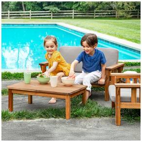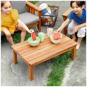 A estrutura é inteiramente produzida em madeira acácia, material naturalmente resistente às intempéries, indicada para uso permanente em ambientes externos, desde que sejam seguidos cuidados básicos de limpeza e manutenção. O tampo retangular de linhas simples e acabamento em tom natural se integra visualmente a outras peças da coleção externa infantil, como sofás e poltronas, formando um conjunto coerente e acolhedor.?