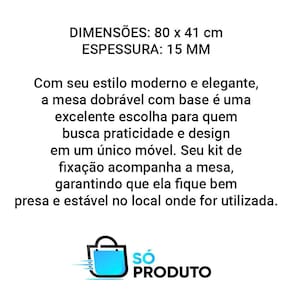 Com seu estilo moderno e elegante, a mesa dobrável com base é uma excelente escolha para quem busca praticidade e design em um único móvel. Ela é perfeita para ser usada como mesa de apoio em diferentes ambientes, como sala de estar, quarto, escritório, entre outros. Seu kit de fixação acompanha a mesa, garantindo que ela fique bem presa e estável no local onde for utilizada.