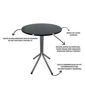 Mesa Bistrô Baixo Cinza com Tampo Redondo PretoQuem não gosta de reunir os amigos e familiares para confraternizar e fazer um aperitivo?E por que não apostar em toda a versatilidade da Mesa Bistrô? Com pernas alongadas para que os convidados possam ficar de pé ou combinar com banquetas, ela tem tampo redondo ideal para apoiar petiscos e os copos. De estrutura firme, ela é um complemento e tanto para a varanda gourmet, áreas sociais da casa ou bares.Características da Mesa BistrôModelo: Baixo Material Bistrô: Tubo 1 e 1/8Material do Tampo: MDF 15mm Acabamento Mesa: Pintura Epóxi em Pó Acabamento Tampo: Pintura UVMontagem: Encaixe simples e parafusos no tampoMedidasAltura Total do Produto: 78cmDiâmetro da Tampa: 60cmEspessura da Tampa: 15mmPeso Máximo Recomendado sob o Produto: 15 kgConteúdo da Embalagem: 1 Mesa Bistrô BaixoDicasNão deixe seu bistrô exposto ao sol por mais de 4 horas;Não use produtos abrasivos na limpeza do seu bistrôUsar um pano umedecido na limpeza do bistrô e, logo em seguida, seque-as com um pano seco.A tonalidade da cor pode variar de acordo com o lote do fabricante e/ou as configurações de seu monitor.*Imagens meramente ilustrativasGarantia3 Meses contra defeito de fabricação