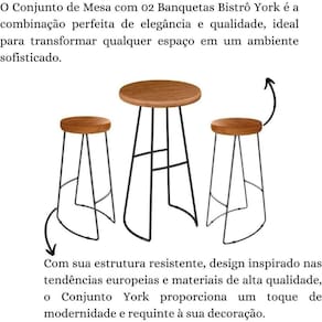 O Conjunto de Mesa com 02 Banquetas Bistrô Aurora é um verdadeiro encanto para qualquer ambiente. Este produto foi cuidadosamente projetado para oferecer um elevado padrão de beleza, estética e qualidade, transformando seu espaço em um local deslumbrante. Foi concebido para aprimorar sua área de lazer, espaço gourmet e também se encaixa perfeitamente em halls de entrada, bares e restaurantes.