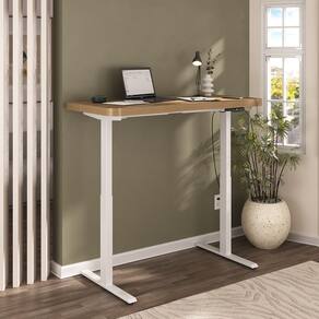 "Tampo em Tamburato 50mm com fita de borda ABS 1mm de espessura; - Proteção contra colisão; - Sistema anti dessincronização de elevação dos pés; - Proteção contra superaquecimento dos motores; - Fonte de alimentação bivolt 100v - 240v; - Plug 10A padrão NBR com cabo de aproximadamente 2,45 m de comprimento; - 1 unidade de comando com teclado integrado e display digital em cm ou pol.; - 1 entrada de alimentação USB-A e 1 entrada de alimentação USB-C posicionadas ao lado da unidade de comando; - Função memória para até 3 regulagens de altura personalizadas; - 2 colunas com motor integrado com velocidade de subida de 25 mm/s; - 4 sapatas plásticas com regulagem de altura; - Acompanha kit com presilhas adesivas para organização dos cabos; - Fixação com parafuso; - Capacidade de carga: 80 Kg distribuídos uniformemente no tampo;"
