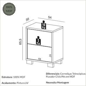 Mesa de cabeceira de 54cm com duas gavetas, produzida 100% em MDF, acabamento em pintura uv 7 camadas, alta durabilidade, na cor freijo fosco e frentes em off white brilho, corrediças metálicas telescópicas, puxador click, pés em mdf com acabamento em pintura uv Acabamento da Gaveta: Pintura UV Acabamento dos Pés: Pintura Altura dos Pés: 6,5 cm Ambiente Principal: Quarto codigo_ean: 7900288128485 Complexidade da Montagem: Média: pode ser montado por mais de uma pessoa e/ou necessite de maior conhecimento para montagem Cor: Freijó Madeirado Cor do Produto: Freijó Madeirado Cor Interna: Freijó Fosco Escala de Brilho: Fosco Escala de Brilho da Gaveta: Brilhante Gaveta com Chave: Não Itens Inclusos: 1 Mesa Cabeceira, Manual de Montagem e Kit Ferragens Linha ou Coleção: PRADEL Manual de Montagem e Instalação: https://product-hub-prd.madeiramadeira.com.br/132897080/documents/5e56f77c-07ef-4ac4-bc64-22ff80cab65a2872793378117454285309326.pdf Marca: Pradel Móveis Material da Gaveta: MDF Material dos Pés: MDF Material Principal: MDF Necessita Montagem: Sim Origem do Produto: Nacional Pés Reguláveis: Não Peso: 20 kg Peso Máximo por Gaveta: 5 kg Pet Friendly: Não Possui Espelho: Não Possui Possui Nichos: Não Possui Pés: 04 Possui Portas: Não Possui Prateleiras: Não Possui Vidro: Não Recomendações de Uso, Manutenção e Limpeza: Pano seco Sapatas Niveladoras: Não Sistema de Montagem: mini fix Suporta Até (kg): 20 kg Tipo de Corrediça da Gaveta: Metálica Telescópica Tipo de Puxador da Gaveta: Não Possui - Abertura por Fecho Toque