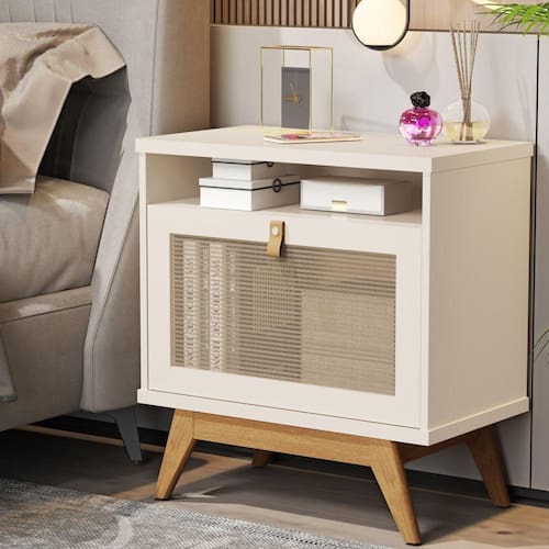 Produto com design inovador. Possui porta em rattan, puxador em couro sintético, pés e travas em madeira maciça.