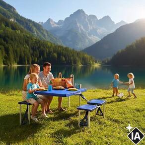 O grande diferencial dessa mesa está na sua estrutura dobrável tipo maleta, que facilita o transporte e o armazenamento. Pesando apenas 6,9 kg, pode ser carregada facilmente no porta-malas do carro ou na mão, sem ocupar muito espaço. Ao ser aberta, já vem acompanhada de 4 banquetas integradas, garantindo assentos confortáveis para até 4 pessoas.