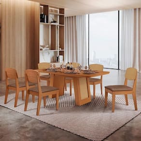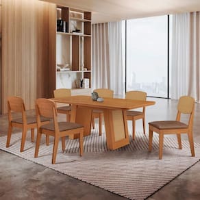 ja as cadeiras se destacam pelo encosto em MDF moldado, que oferece suporte ergonomico ideal, alem do estofado macio que garante o maximo conforto. Seu acabamento refinado e os detalhes no encosto que imitam rattan, criando uma harmonia visual com as cadeiras e adicionando um toque de charme natural ao espaco.