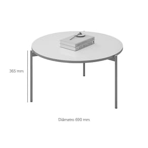 Tipo de Formato Tampo da Mesa - Tampo Redondo Tipo das Quinas do Tampo da Mesa - Bordas Arredondadas Tipo dos Pés - Pés Metálicos