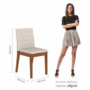Detalhes Técnicos das Cadeiras -Assento Tapeçado, Estofado e Fixo -Pintura UV Texturizada -Estrutura: MDF 18mm e 25mm -Assento: D16 -Suporta até 90kg (cada) -Medida de cada Cadeira: A:95cm | L:44cm | P:50cm -Tonalidade: Freijó/Suede Bege