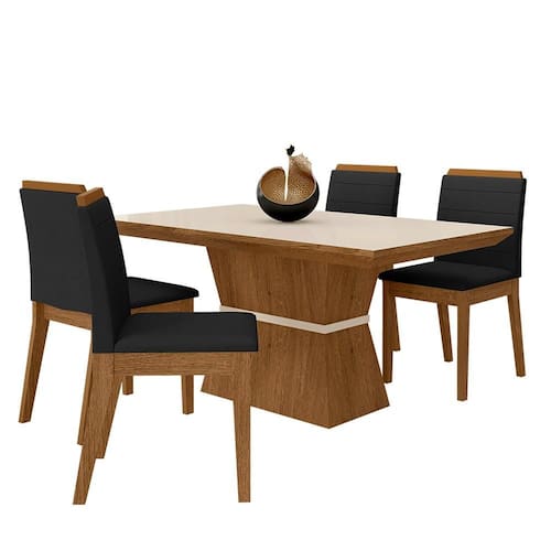 O conjunto de mesa com 4 cadeiras Nantes possui um tampo espaçoso de 1,36, ideal para refeições em grupo, enquanto as cadeiras são projetadas para garantir conforto durante as refeições.