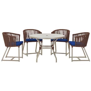 Descubra a Elegancia e Durabilidade da Mesa de Jantar Roma e Cadeiras Noronha. Combinando estilo e resistencia, esta Mesa e cadeiras traz o melhor do design contemporaneo em aluminio com micro pintura e acabamento em corda nautica. O estofado impermeavel completa o conforto e a funcionalidade, tornando-a ideal para ambientes externos e internos.