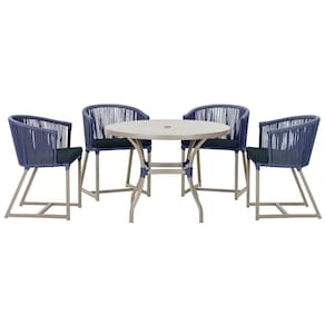 Descubra a Elegancia e Durabilidade da Mesa de Jantar Roma e Cadeiras Noronha. Combinando estilo e resistencia, esta Mesa e cadeiras traz o melhor do design contemporaneo em aluminio com micro pintura e acabamento em corda nautica. O estofado impermeavel completa o conforto e a funcionalidade, tornando-a ideal para ambientes externos e internos.