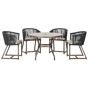 Descubra a Elegancia e Durabilidade da Mesa de Jantar Roma e Cadeiras Noronha. Combinando estilo e resistencia, esta Mesa e cadeiras traz o melhor do design contemporaneo em aluminio com micro pintura e acabamento em corda nautica. O estofado impermeavel completa o conforto e a funcionalidade, tornando-a ideal para ambientes externos e internos.