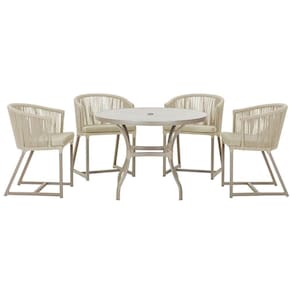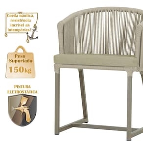 Descubra a Elegancia e Durabilidade da Mesa de Jantar Roma e Cadeiras Noronha. Combinando estilo e resistencia, esta Mesa e cadeiras traz o melhor do design contemporaneo em aluminio com micro pintura e acabamento em corda nautica. O estofado impermeavel completa o conforto e a funcionalidade, tornando-a ideal para ambientes externos e internos.