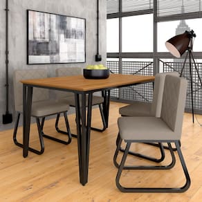 O Conjunto Sala de Jantar Ibiza possui um design industrial e sofisticado, perfeito para dar aquele toque inigualável e convidativo em seu ambiente!Detalhes Técnicos da Mesa:- Acabamento da Mesa: Pintura Texturizada- Tipo de Pintura: UV Texturizada- Quantidade de Lugares: 04- Estrutura da Mesa: Metálica- Tonalidade da Estrutura da Mesa: Preto Fosco- Material do Tampo: MDF de 25mm- Medida da Mesa Montada: A:76cm | L:136cm | P:90cm- Tonalidade do Tampo: CinamomoDetalhes Técnicos das Cadeiras:- Acabamento da Cadeira: Assento e Encosto Estofados- Almofada do Assento: Fixa- Cadeira Estofada: Sim- Peso Suportado da Cadeira: 90KG- Facilidade da Montagem: Média- Tonalidade da estrutura da Cadeira: Preto Fosco- Tonalidade do Tecido: Veludo Bege- Tipo de Pintura: UV Texturizada- Material da Estrutura: Metálica- Medida de cada Cadeira: A:86cm | L:44cm | P:56,5cmConteúdo da Embalagem:- 01 Mesa- 04 Cadeiras- Manual de Montagem- Acessório para MontagemObservações Importantes:- As imagens ambientadas são meramente ilustrativas e podem apresentar itens que não incorporam o produto;- Todos os nossos produtos são novos, acompanham documento fiscal e possuem garantia de 3 meses, essa garantia cobre somente defeitos de fabricação;- A entrega só será efetuada no endereço do CEP, caso o endereço seja diferente do CEP informado no pedido, a entrega terá cobrança adicional e o comprador arcará com as despesas;- Não realizamos entregas para zonas rurais, via caminhos fluviais e distritos, por isso não aceitamos CEP GERAL da região;- Não é possível realizar o agendamento de entrega do produto, é necessário que acompanhe o rastreio de seu pedido para saber a previsão de entrega;- As entregas somente serão realizadas para um responsável maior de idade (+18);- Enviamos para diversos estados, sendo assim nossas entregas são realizadas por transportadoras parceiras de nossa empresa. Confira as dimensões antes da compra e certifique-se de que o produto passará por elevadores, portas e corredores já que nossa entrega não inclui a subida de lances de escada, transporte por elevador e o lançamento de produtos, em caso de condomínios residenciais a entrega é feita somente até a portaria. Todas as entregas são realizadas em dias e horários comerciais;- Ao receber os seus produtos observe se a embalagem se encontra em perfeitas condições. Se você adquiriu algum móvel, confira atentamente a quantidade de volumes e o aspecto físico das embalagens. Confira também se a cor do móvel está de acordo com o seu pedido;- O prazo de cancelamento por arrependimento é de até 7 dias corridos a contar da data de recebimento;- Os produtos e assistências são enviados DESMONTADOS, MONTAGENS E DESMONTAGENS recomendamos sempre a contratação de um montador profissional e é válido lembrar que o custo desses serviços é por conta do comprador;- Objetos decorativos que aparecem na foto não acompanham o produto;- Evitar a exposição direta à luz solar e à umidade;- Para limpeza, limpar com pano macio e seco, não utilizar qualquer outro tipo de produtos químicos;- As cores do produto podem variar de acordo com o monitor, a iluminação do ambiente ou sua percepção visual;