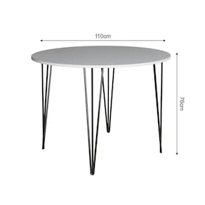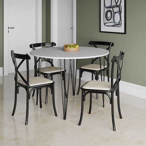 Mesa Com 4 Cadeiras Katrina Preta Elen Hairpin 110cm Jantar Branca Com Ferro PretoA sua cozinha ou sala de jantar só está completa com uma boa combinação de mesa e cadeira para reunir a família e amigos, se você busca um móvel de qualidade e com combinação de cores, o modelo Elen e Katrina é para você! Com tampo redondo e estrutura em ferro, ela acomoda os seus convidados enquanto complementa a decoração com sofisticação e qualidade.Tipo: ConjuntoModelo: Elen e KatrinaCor Tampo: BrancoBase: PretoMedidas MesaAltura: 76cmDiâmetro: 110cmMedidas Cadeira:Altura: 90cmLargura: 48cmComprimento: 46cmATENÇÃOIMAGENS MERAMENTE ILUSTRATIVAS, PODENDO HAVER UMA PEQUENA VARIAÇÃO DE COR DEPENDENDO DE CADA TELA OU MONITOR. Mesa com 4 Cadeiras Katrina Preta Elen Hairpin 110cm Jantar Branca com Ferro Preto
