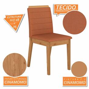 Detalhes Técnicos das Cadeiras -Assento e Encosto Tapeçados, Estofados e Fixos -Peso Suportado da Cadeira:90KG -Facilidade da Montagem:Média -Tonalidade da Cadeira: Cinamomo/Suede Terracota - Assento:D16 - Encosto:D14 -Tipo de Pintura:UV Texturizada -Material Estrutura:MDF 25mm/18mm -Medida da Cadeira:95CMx44CMx50CM