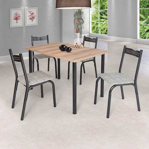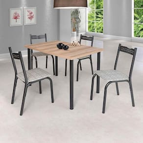 Este conjunto inclui uma mesa e quatro cadeiras, todos com estrutura e pés em aço carbono High-Steel, garantindo resistência e proteção contra ferrugem. As cadeiras possuem assentos de madeira com revestimento em corino sintético e sapatas nos pés para proteger tanto o produto quanto o piso de riscos, suportando até 100 kg cada. A mesa apresenta tampo em MDP BP, ideal para refeições em família ou encontros sociais.