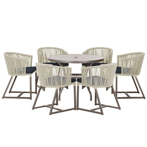 Combinando estilo e resistencia, esta Mesa e cadeiras traz o melhor do design contemporaneo em aluminio com micro pintura e acabamento em corda nautica. O Estofado impermeavel completa o conforto e a funcionalidade, tornando-a ideal para ambientes externos e internos.